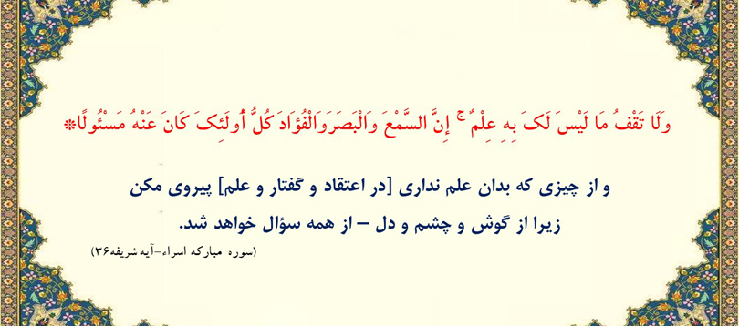 [38]. اسراء، آيه 36: «وَ لا تَقْفُ ما لَيْسَ لَكَ بِهِ عِلْمٌ... .»