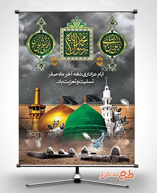 پیشنهاد میکنیم برای مشاهده مجموعه کامل طرح بنر دهه آخر صفر به سایت طرح دات آی آر به نشانی tarh.ir مراجعه کنید. طرح لایه باز دهه آخر صفر در سایت طرح دات آی آر شامل طرح تسلیت دهه آخر صفر، طرح تسلیت رحلت پیامبر اکرم، طرح بنر شهادت امام حسن، طرح بنر شهادت امام رضا و طرح اطلاعیه مراسم دهه آخر صفر در ابعاد گوناگون مانند پوستر، بیلبورد، پلاکارد، استند، لمپوست و ... است.