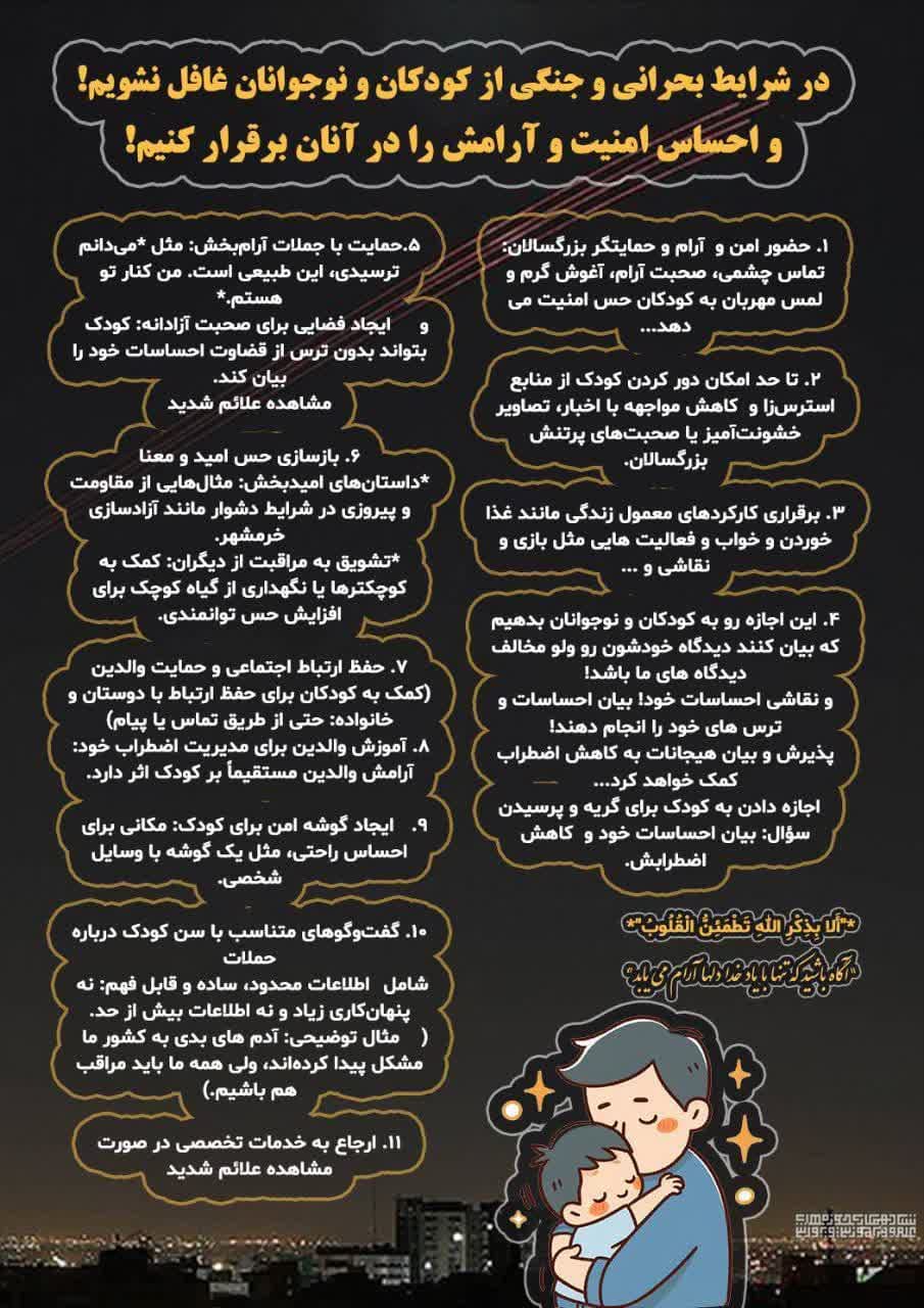 توصیه های ایمنی تاریخ انتشار: 08:47 - 1404/03/29 توصیه های ایمنی؛ توصیه هایی برای حفظ امنیت روانی خانواده در شرایط جنگی کشور روایت صادق حفاظت اطلاعات توصیه های ایمنی روایت صادق دفتر تبلیغات اسلامی جنگ توصیه افزودن دیدگاه جدید نام شما دیدگاه درباره قالب های متنی متن ساده تگهای HTML مجاز نیستند. خطوط و پاراگرافها بطور خودکار اعمال میشوند. آدرس های صفحه وب و آدرس های ایمیل به طور خودکار به پیوند تبدیل می شوند.