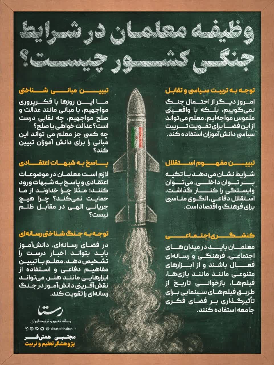 وظیفه معلمان در شرایط جنگی کشور چیست تاریخ انتشار: 17:51 - 1404/04/02 اینفوگرافی | وظیفه معلمان در شرایط جنگی کشور چیست؟ مجتبی همتیفر، پژوهشگر تعلیم و تربیت روایت صادق اتاق عملیات واحد بسیج عمومی روایت صادق دفتر تبلیغات اسلامی وظیفه معلمان وظیفه افزودن دیدگاه جدید نام شما دیدگاه درباره قالب های متنی متن ساده تگهای HTML مجاز نیستند. خطوط و پاراگرافها بطور خودکار اعمال میشوند. آدرس های صفحه وب و آدرس های ایمیل به طور خودکار به پیوند تبدیل می شوند.