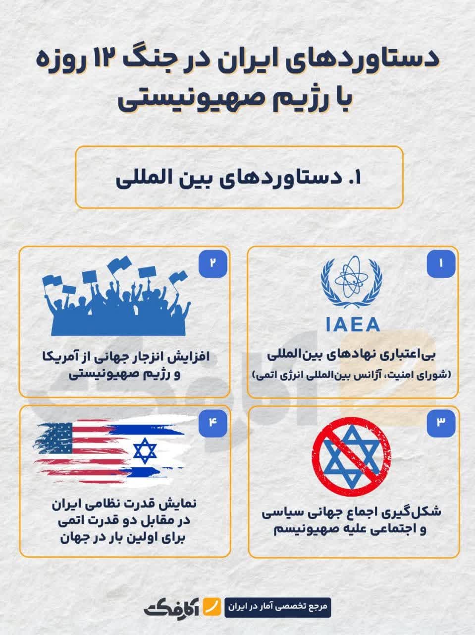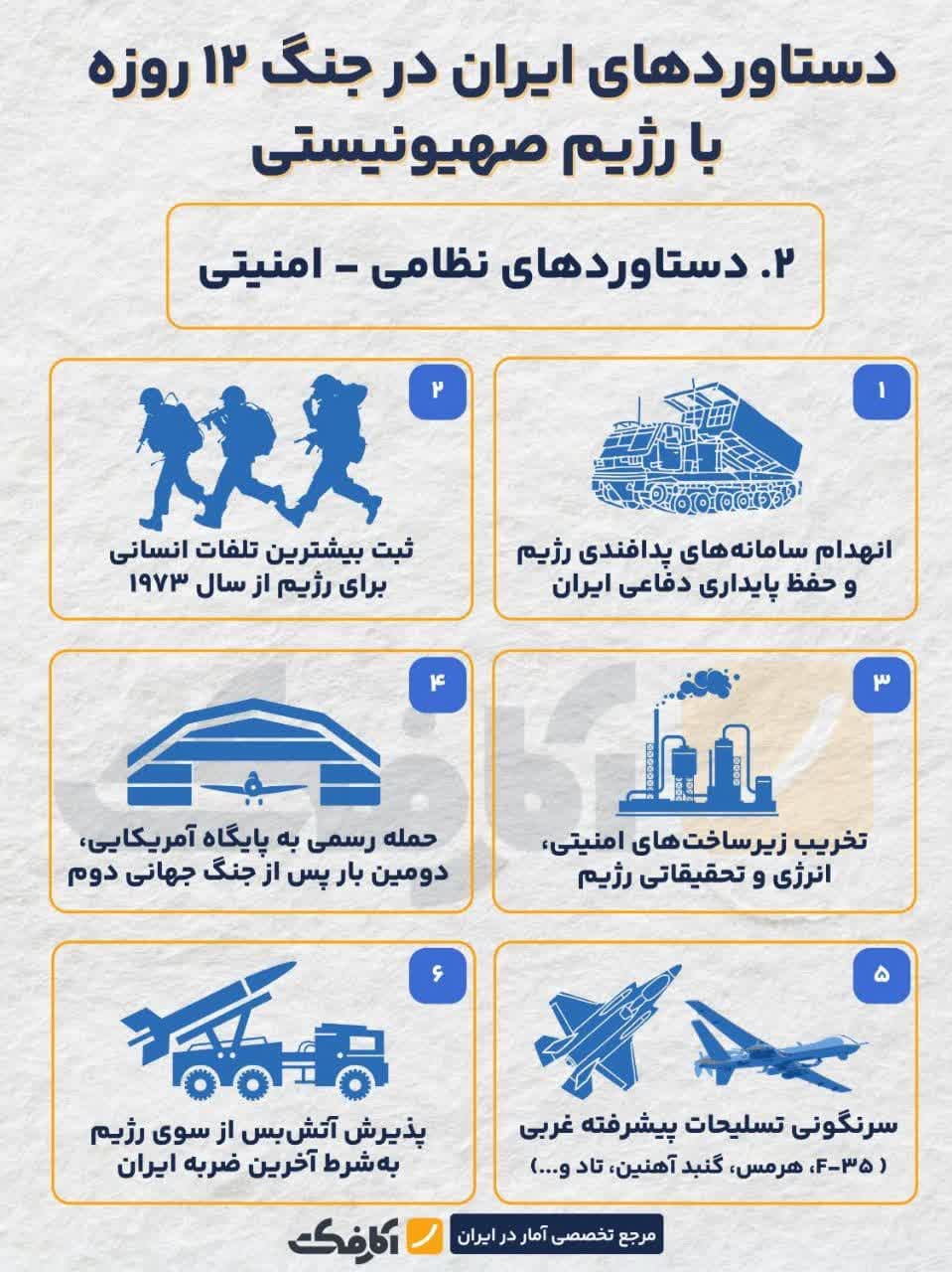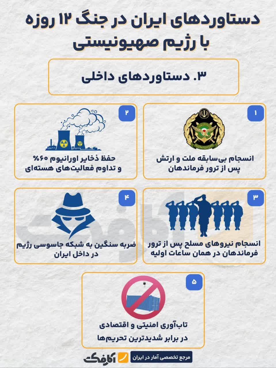 🔹همچنین دستاوردهای نظامی و داخلی از جمله انهدام سامانههای ضد موشکی رژیم، سرنگونی چند فروند جنگنده پیشرفته و همراهی عظیم مردم با نیروهای مسلح نیز از جمله آنها به شمار میرود.