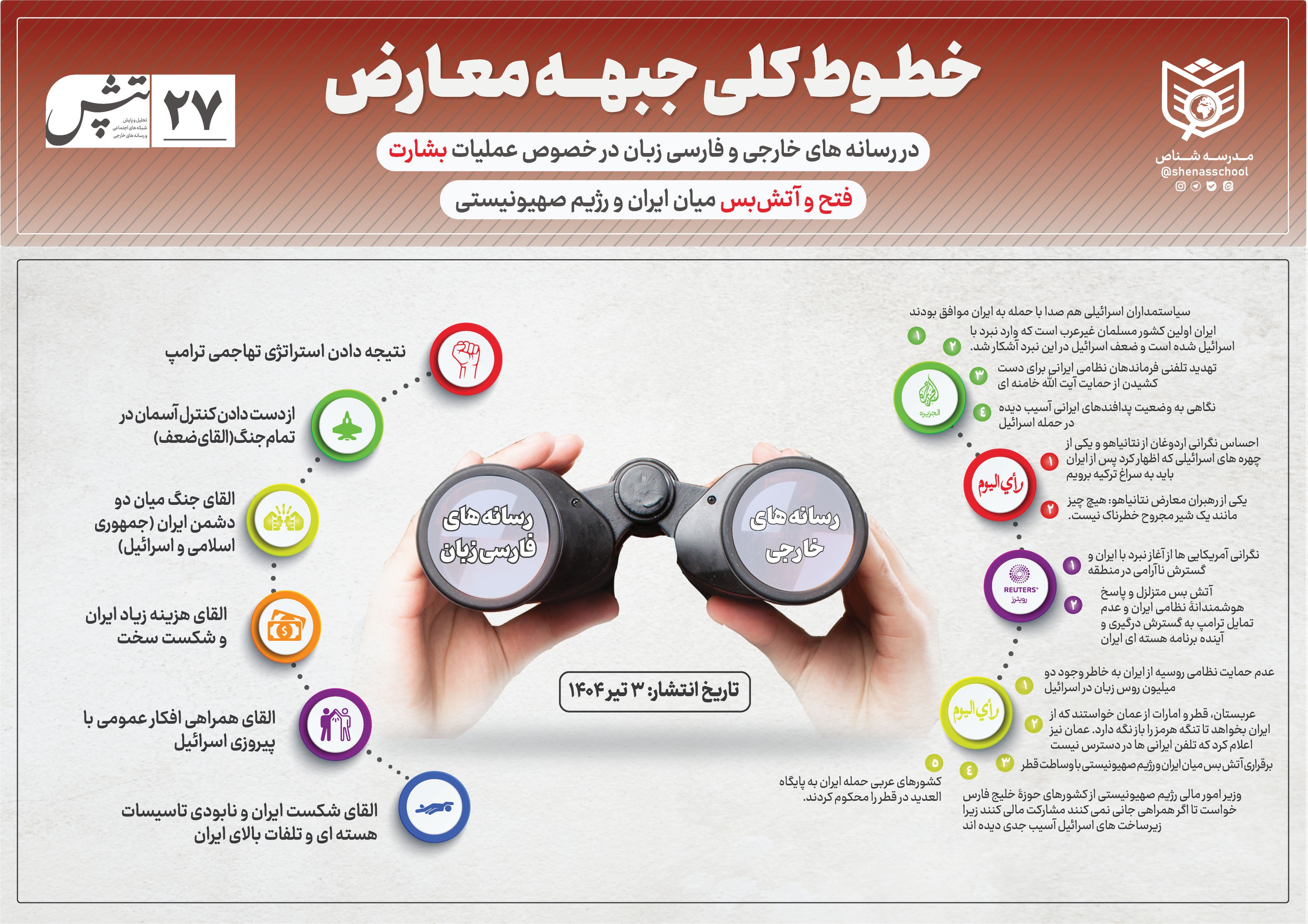 خطوط کلی جبهه معارض تاریخ انتشار: 15:09 - 1404/04/09 خطوط کلی جبهه معارض در رسانههای خارجی و فارسیزبان درباره عملیات بشارت فتح و آتشبس میان ایران و رژیم صهیونیستی روایت صادق عقیدتی سیاسی تحلیل سیاسی روایت صادق دفتر تبلیغات اسلامی خطوط کلی جبهه معارض افزودن دیدگاه جدید نام شما دیدگاه درباره قالب های متنی متن ساده تگهای HTML مجاز نیستند. خطوط و پاراگرافها بطور خودکار اعمال میشوند. آدرس های صفحه وب و آدرس های ایمیل به طور خودکار به پیوند تبدیل می شوند.