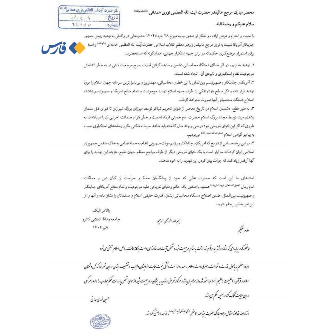 آیتالله نوری همدانی: اهانت به رهبر انقلاب، اهانت به اصل اسلام است و هرگونه تعرض و تهدید ایشان از طرف دولت یا شخص، حکم محاربه دارد.
