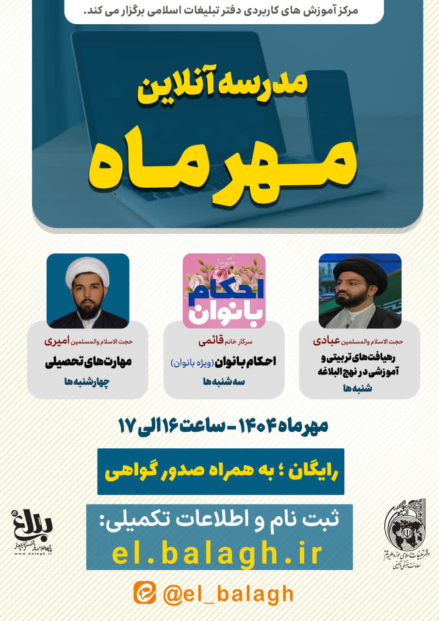 مرکز آموزش های کاربردی معاونت فرهنگی و تبلیغی دفتر تبلیغات اسلامی حوزه علمیه قم، مدرسه آنلاین مهر ماه 1404 را برگزار میکند.