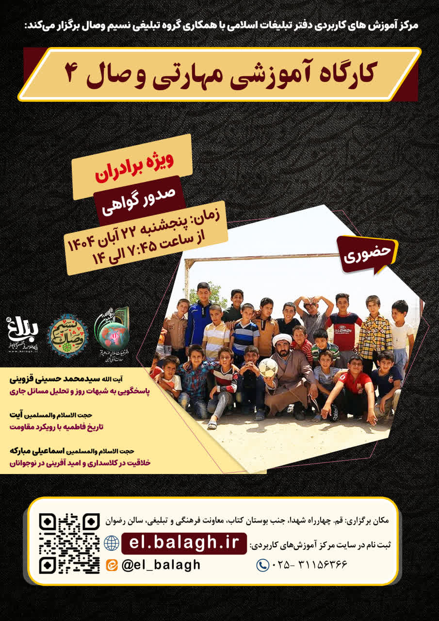 به گزارش خبرنگار بلاغ، مرکز آموزش های کاربردی معاونت فرهنگی و تبلیغی دفتر تبلیغات اسلامی با همکاری گروه تبلیغی نسیم وصال، کارگاه آموزشی مهارتی وصال را ویژه طلاب برادر به صورت حضوری و رایگان برگزار میکند.