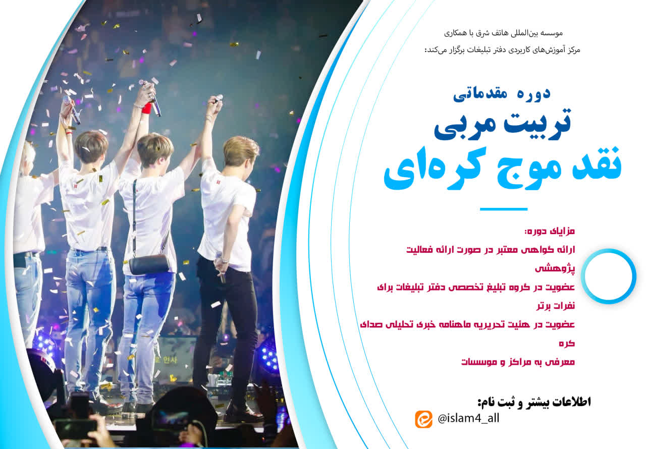 موسسه بینالمللی هاتف شرق با همکاری مرکز آموزشهای کاربردی معاونت فرهنگی و تبلیغی دفتر تبلیغات اسلامی دوره مقدماتی تربیت مربی نقد موج کرهای را برگزار میکند.