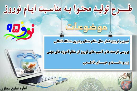 همزمان با فرا رسیدن بهار طبیعت و تحویل سال نو و تقارن آن با میلاد با سعادت حضرت فاطمه سلام الله علیها و اعلام شعار سال از طرف مقام معظم رهبری، طرح تولید محتوای نوروزی از سوی اداره تبلیغ مجازی دفتر تبلیغات اسلامی ویژه مبلغین نوین در راستای تولید و بازنشر معارف فاخر دینی در فضای مجازی ارائه می گردد.