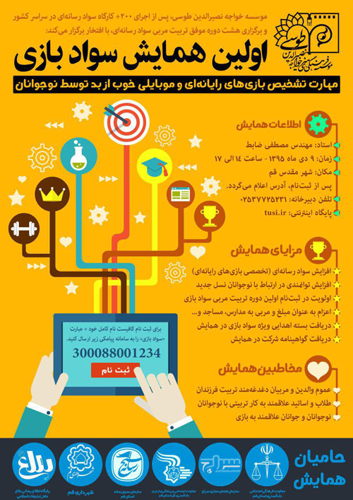 به گزارش بلاغ اولین همایش سواد بازی به همت موسسه فرهنگی هنری خواجه نصیرالدین طوسی و پس از اجرای 200 کارگاه سواد رسانه ای در سراسر کشور و برگزاری هشت دوره موفق تربیت مربی سواد رسانه ای برگزار می گردد.
